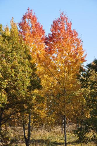 Light green trembling in breeze Fall Color. Narrow oval to pyramidal Foliage. Prairie Gold Aspen 8.